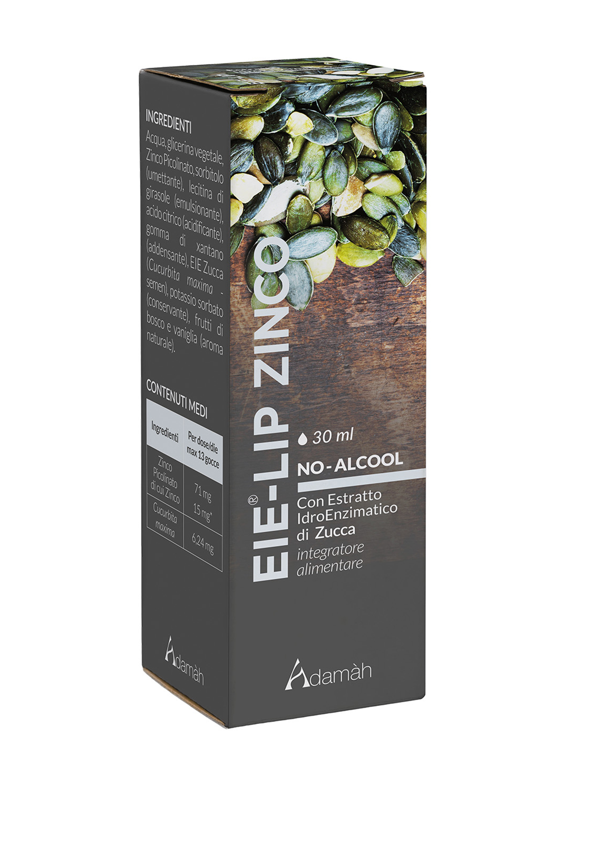 Acqua, glicerina vegetale, Zinco Picolinato, sorbitolo (umettate), lecitina di girasole (emulsionante), acido citrico (acidificante), gomma di xantano (addensante), EIE Zucca (Cucurbita maxima – semi), potassio sorbato (conservante), frutti di bosco e vaniglia (aroma naturale).